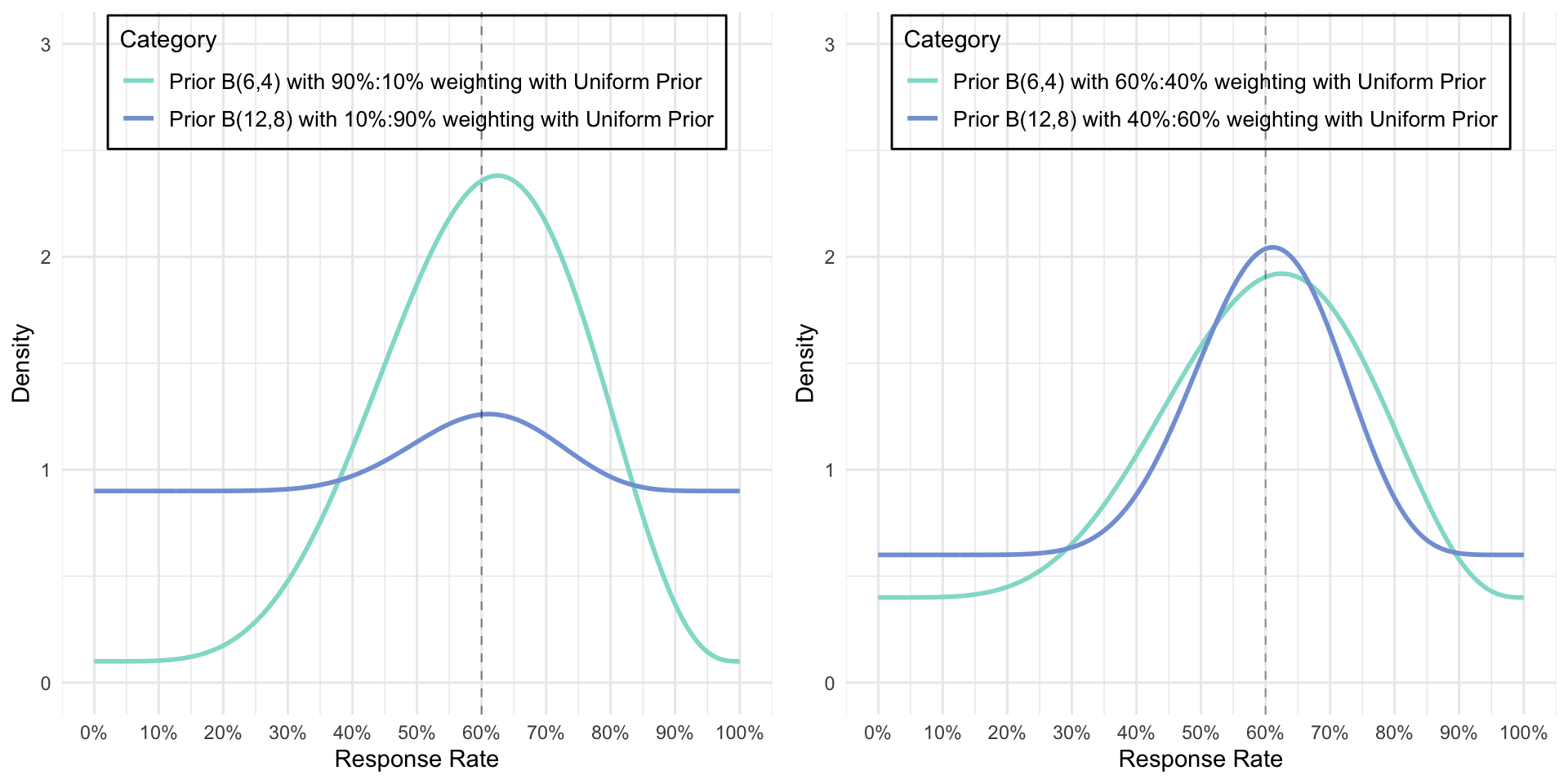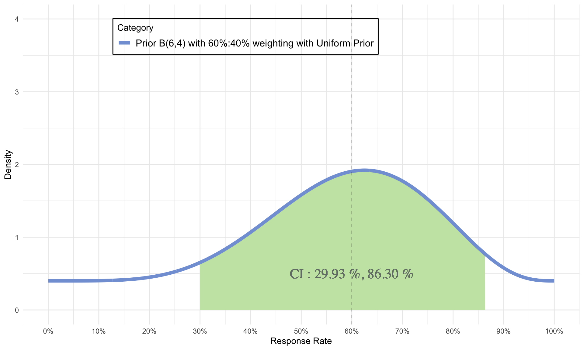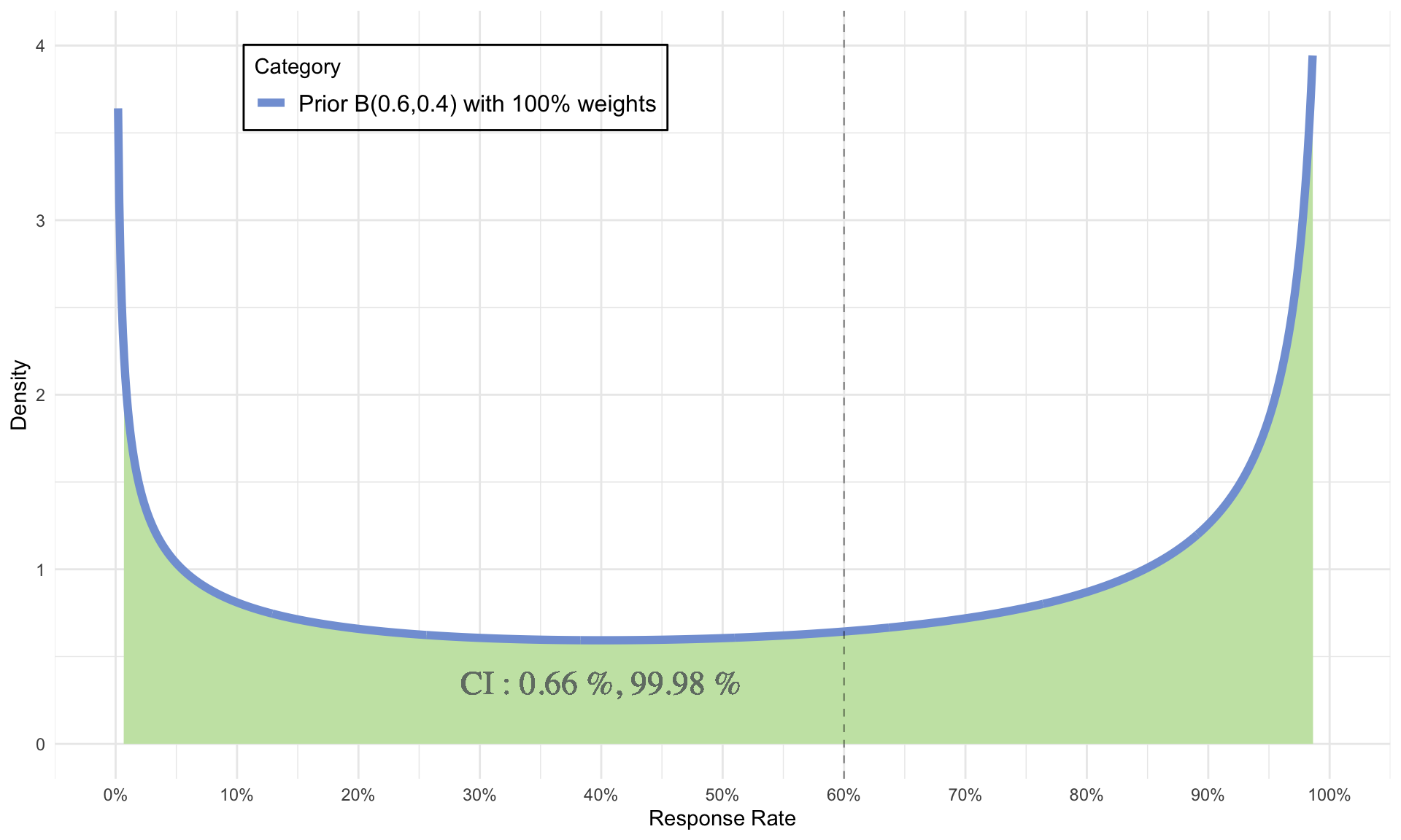 weaker_prior <- phase1b::postprob(x = 16, n = 23, p = 0.60, par = c(0.6, 0.4))