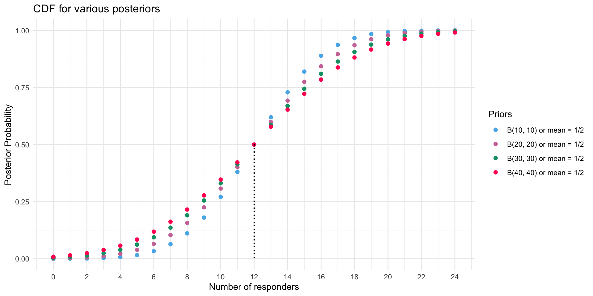 print(paste0("postprob of Weaker prior = ", round(weaker_prior, digits = 4), " and postprob of Stronger prior = ", round(stronger_prior, digits = 4)))[1] "postprob of Weaker prior = 0.836 and postprob of Stronger prior = 0.7954"