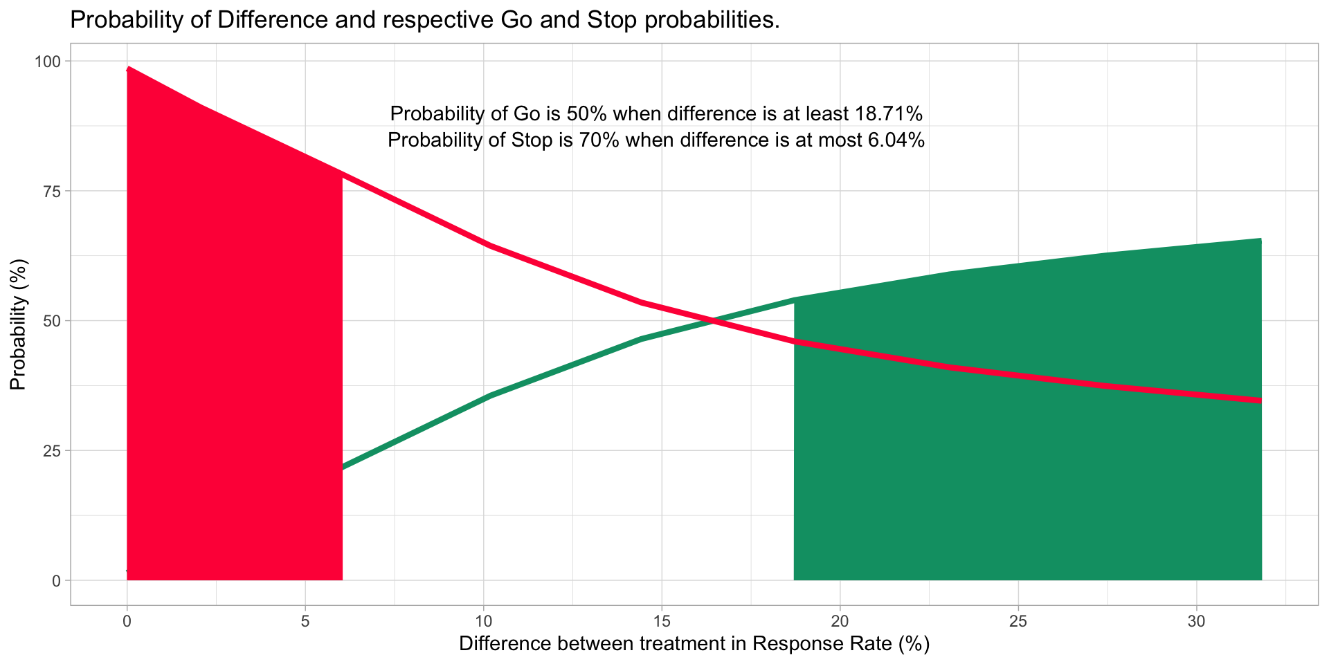 In the relative case, we suppose that the treatment group’s response rate is assumed to be greater than P_S + (1-P_S) * delta such that the posterior is Pr(P_E > P_S + (1 - P_S) * delta | data).