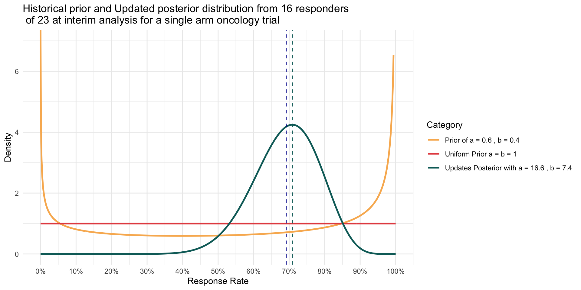 Using the formula for the mean, where \(\alpha = 0.6, \beta = 0.4\) and at interim x = 16, n = 23 : \[ \pi = \ \frac {\alpha}{\alpha + \beta} = \ \frac {\alpha_{updated} }{\alpha_{updated} + \beta_{updated}} = \ \frac {16.6 }{16.6 + 7.4} ≈ 69.17 \% \]