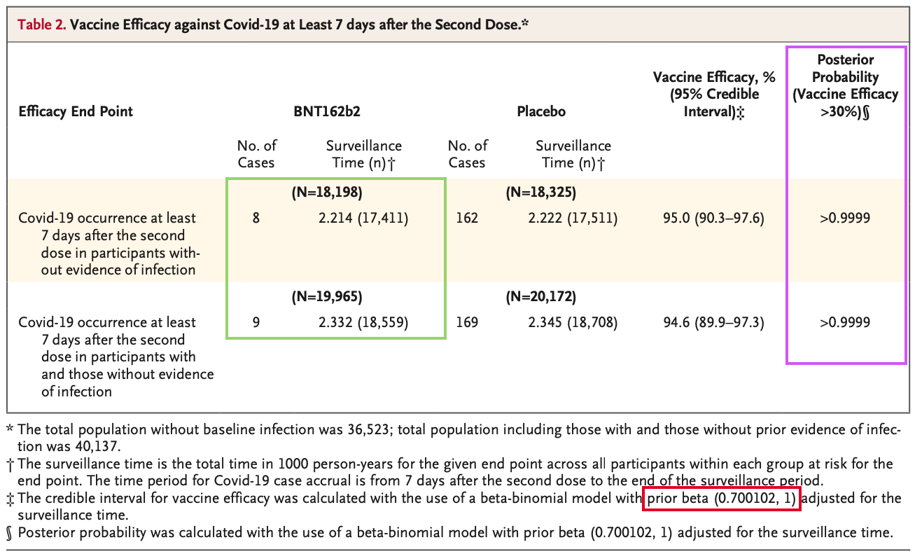 \[ H_{a} : p = Pr(VE > 30 \% \ | \ data, prior) \] Prior is \(Beta(0.700102, 1)\) which corresponds to